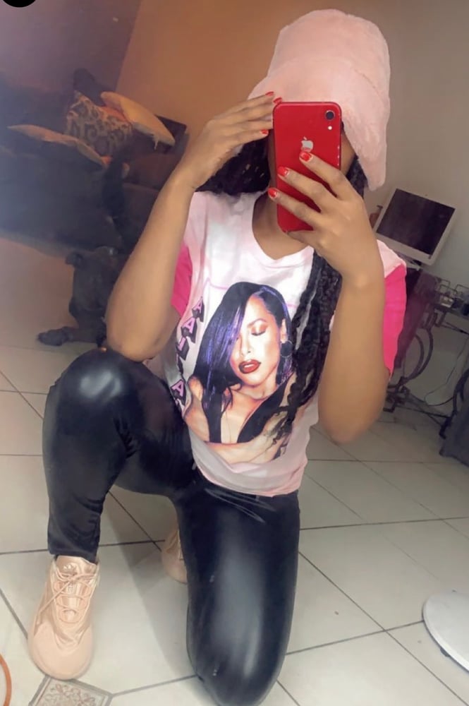 Pink Aaliyah screen t-shirt. Pair this with the “Pink Jogger Skirt” as pictured above. We we always rep and love Aaliyah this way!!!!