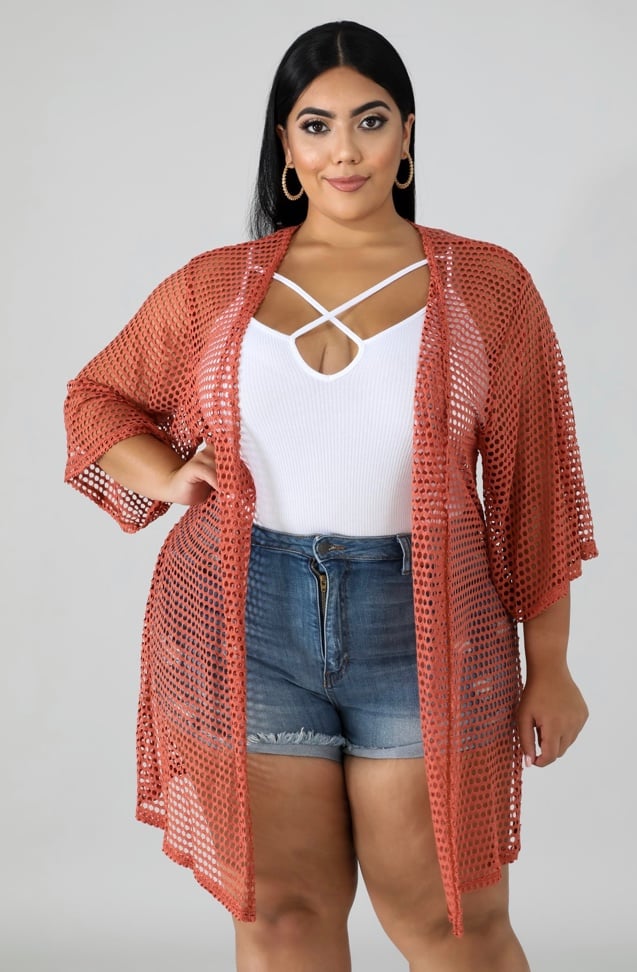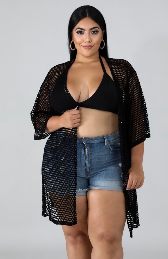Need a cute cover up for your next vacay? This is the one!!! A kimono style fishnet cover has some stretch to it. Rock this with your swimwear or put this over a tank and some shorts.