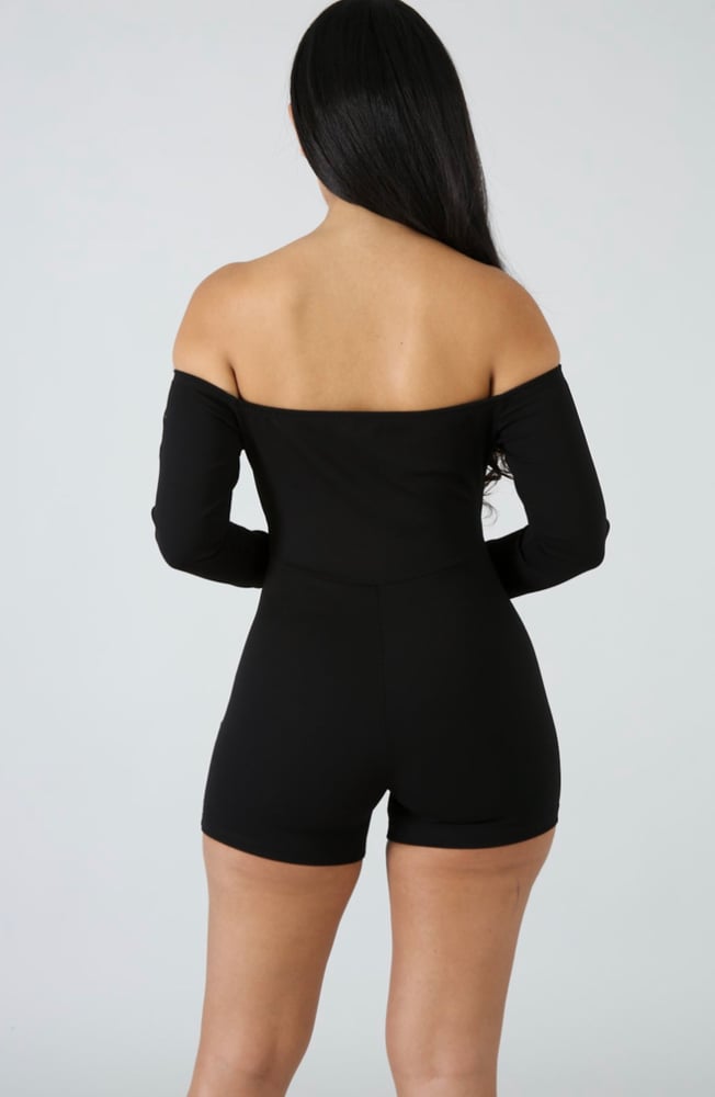 This sexy off the shoulder skort romper is not your average romper. Long sleeve, round neckline and a mid section cut out. 96% polyester 4% spandex Model is wearing a size Large